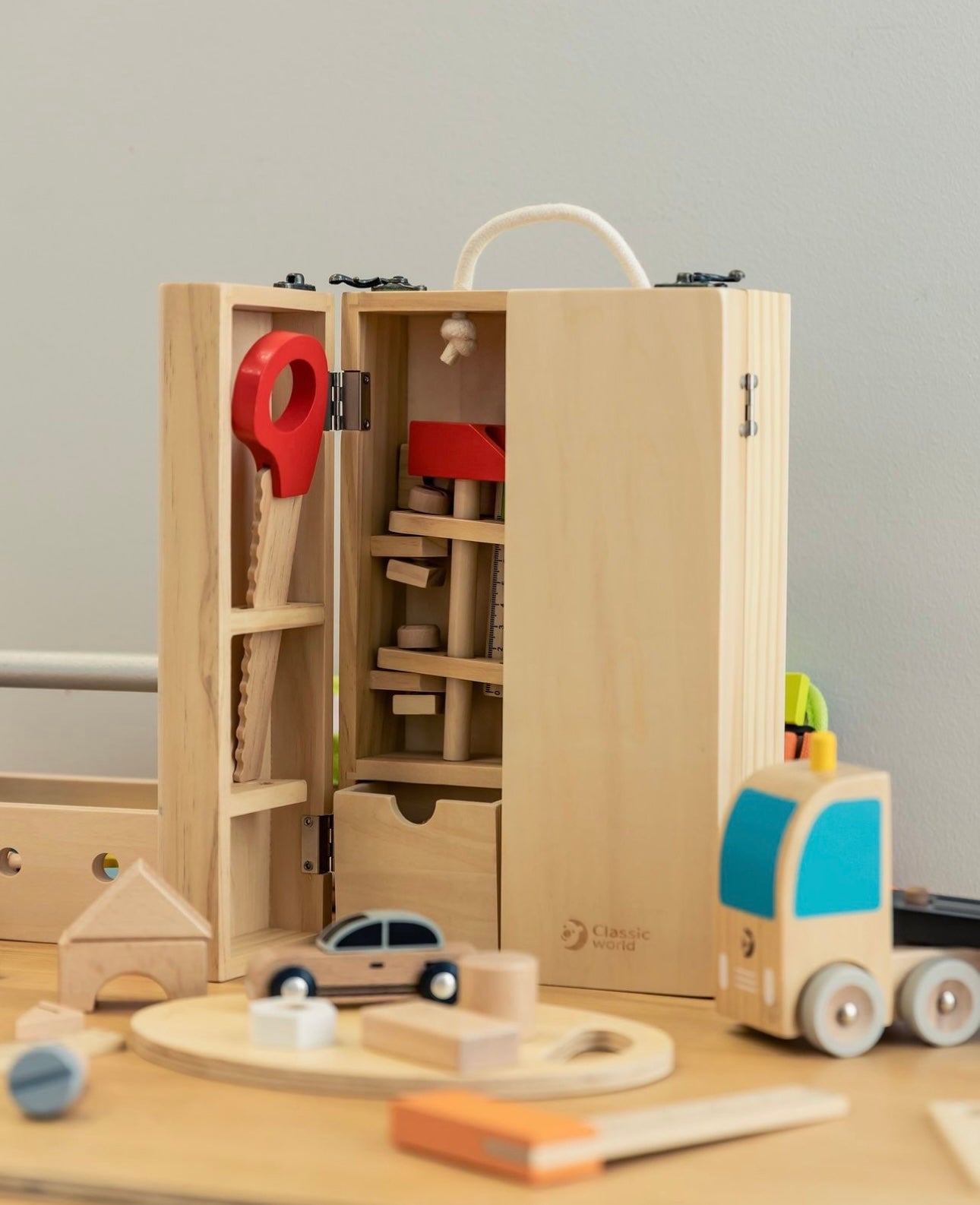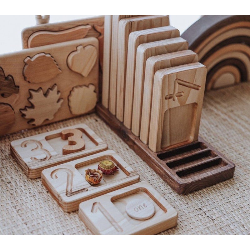Juego de madera lijada y sellada con Cera Osmo que protege la madera y esta certificada para el uso de niños pequeños.