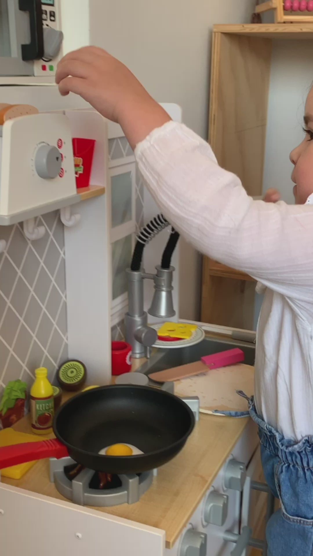 Ideal para complementar cocinas de madera Montessori o juegos de rol familiares.